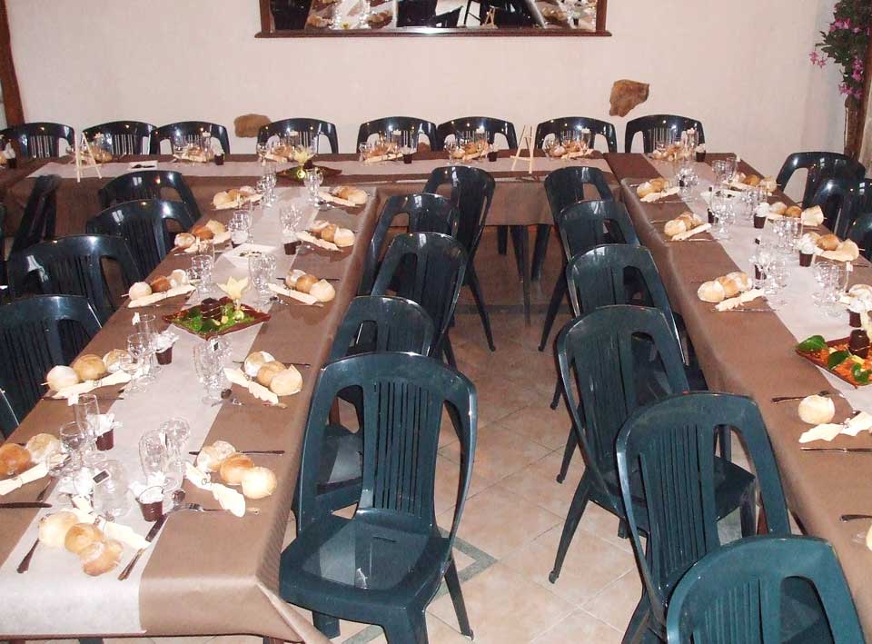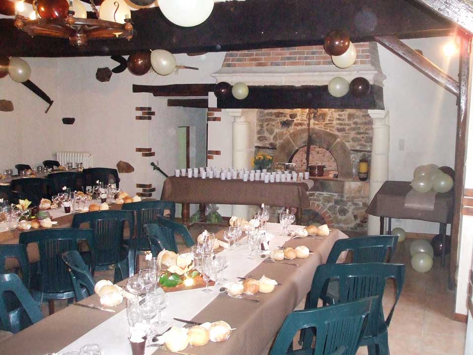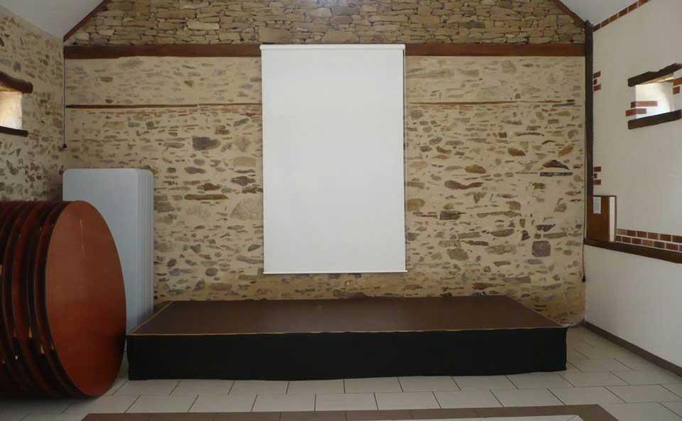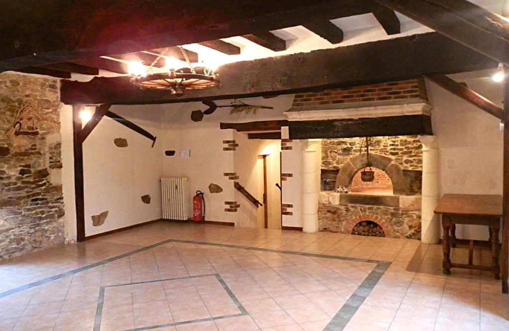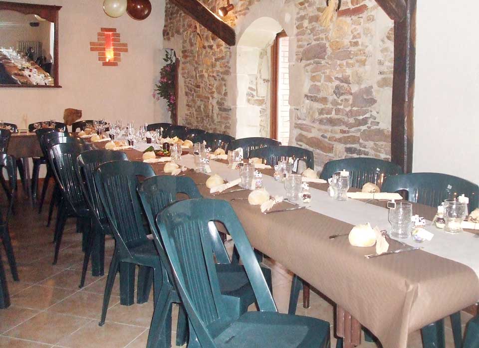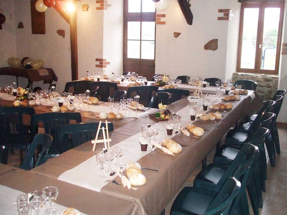 La petite salle dans un style rustique et convivial avec ses vieilles poutres et son four à pain peut recevoir jusqu’à 45 personnes. Elle dispose d’une cuisine, d’un bloc sanitaire et d’une pièce pour faire dormir les plus petits.
