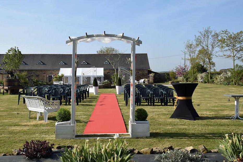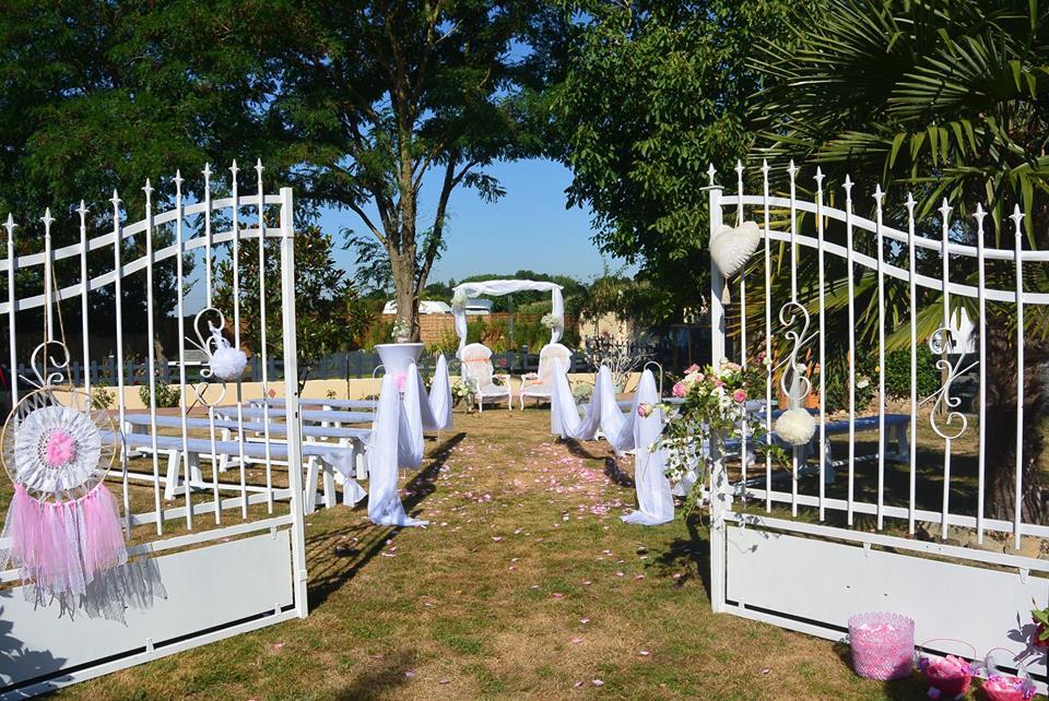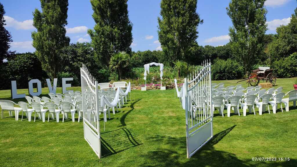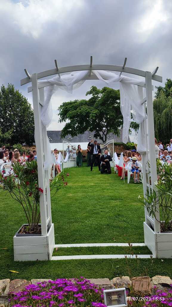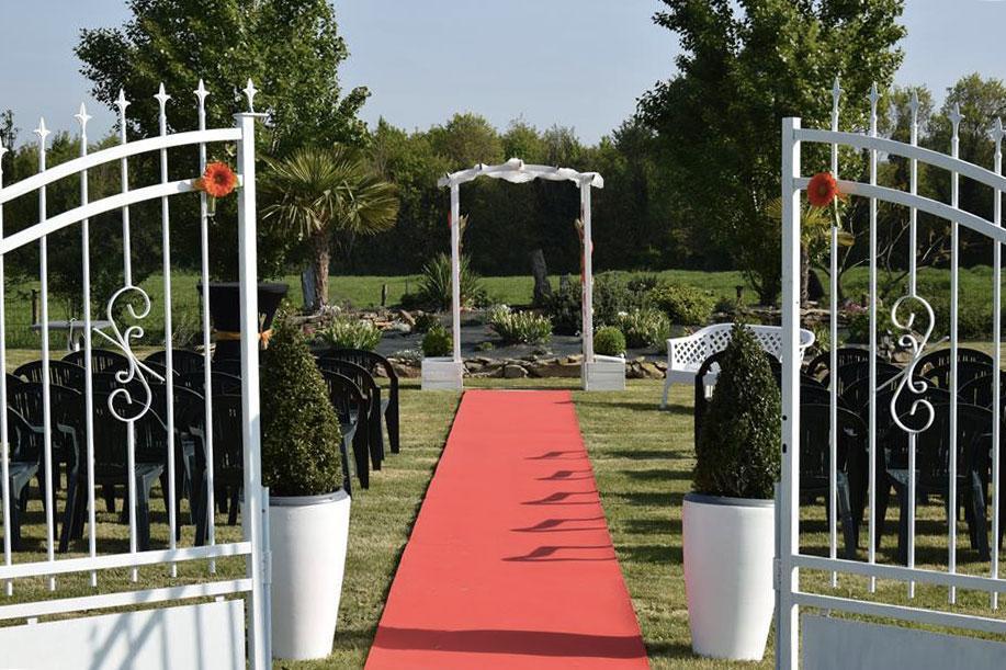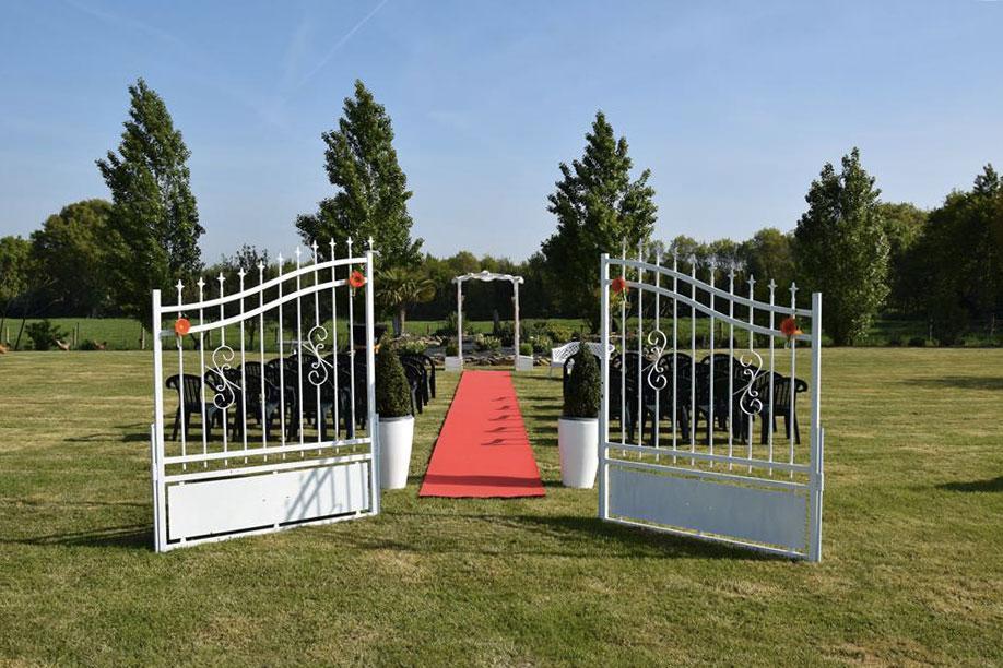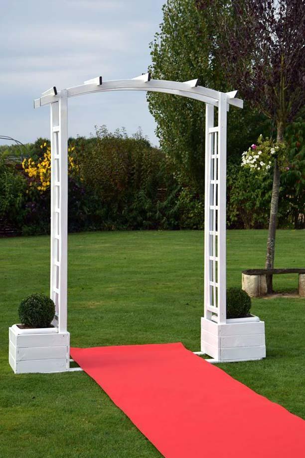 Pour vos cérémonie laïque nous vous proposons l’entrée de cérémonie avec ce portail en fer forgé blanc, le tapis rouge et l’arche en bois ou arche en acier.