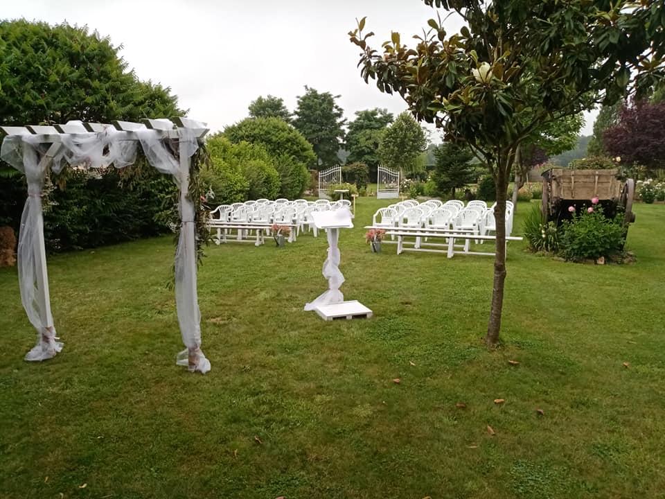 Toujours pour votre cérémonie, choisissez les piquets avec voilage, ou bien ces bancs de 5/6 personnes.